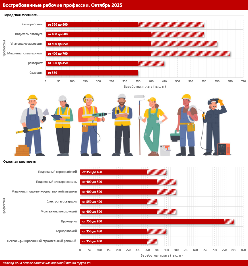 Так, наиболее востребованные рабочие профессии в городской местности — разнорабочий (предлагаемые зарплаты — 350–600 тыс. тг), водитель автобуса (400–600 тыс. тг), упаковщик-фасовщик (400–650 тыс. тг), машинист спецтехники (400–700 тыс. тг), тракторист (350–450 тыс. тг) и сварщик (от 350 тыс. тг).