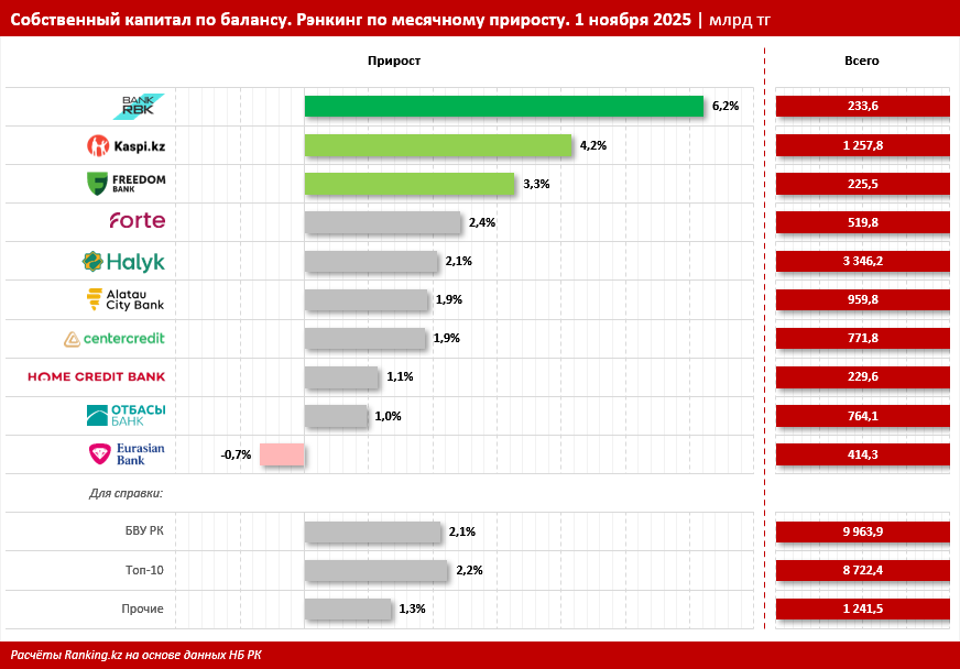 В разрезе БВУ РК по месячному росту собственного капитала по балансу уверенно лидирует с заметным отрывом Bank RBK — плюс 6,2%, до 233,6 млрд тг. Заметим: за год банк прибавил уже 17,9%.