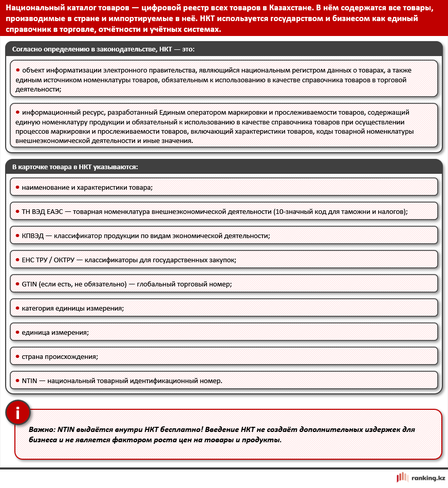 NTIN (National Trade Item Number) — это национальный идентификатор товара в Казахстане. Обязателен для всех товаров, включается в карточку товара в НКТ, присваивается один раз и навсегда, бесплатно. Подробнее о нём расскажем далее.