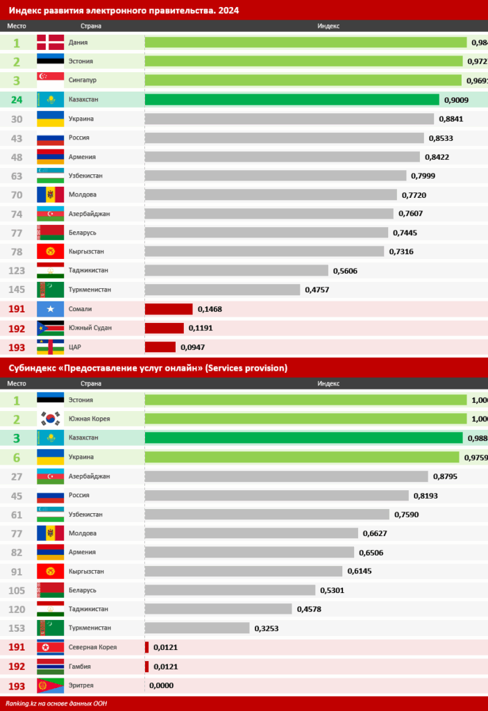 К слову, упомянутые выше Узбекистан и Беларусь, которые уже ввели аналоги НКТ ранее, в рейтинге стран по индексу развития электронного правительства заметно отстают от Казахстана, занимая лишь 63-е и 77-е места соответственно. При этом в субиндексе, основанном на оценке предоставления онлайн-услуг, эти страны оказались лишь на 61-м и 105-м местах.