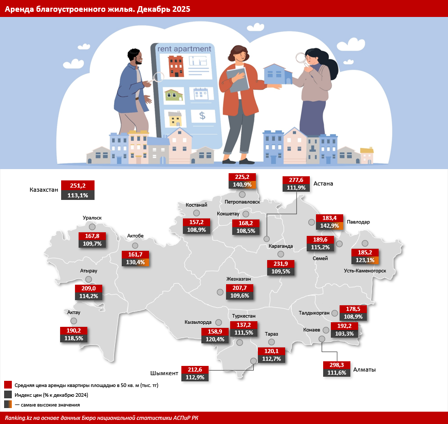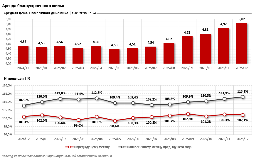 Помесячная динамика данных свидетельствует о том, что с января по август 2025 года стоимость арендного жилья варьировалась в пределах 4,5–4,6 тыс. тг за кв. м. С начала осени наблюдался постепенный рост цен, который и дал по итогам декабря рекордно высокие показатели. Эту динамику можно проследить и по индексу цен. Именно в начале делового сезона спокойные значения динамики на уровне 0,8%–1% перешли к росту на 2,8% за месяц.