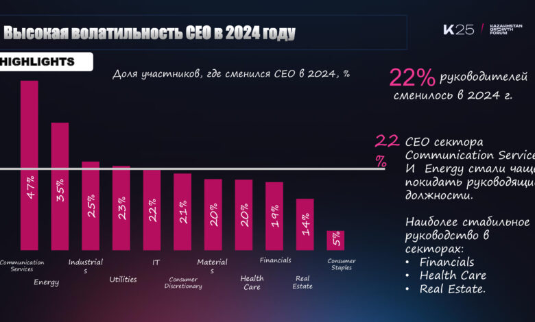 Как показывает исследование Centras 500 (С500) от Kazakhstan Growth Forum (входит в Centras Group), картина сменяемости первых руководителей в 500 крупнейших компаний Казахстана складывается тревожная. В 2024 году каждый пятый CEO в Казахстане покинул свой пост. Этот показатель в 22% выглядит особенно ярко на фоне европейских коллег, где средняя сменяемость составляет 12,3%, и США с их 11,6% в компаниях S&P 500. Фактически, текучесть топ-менеджеров в Казахстане оказалась почти вдвое выше, чем на западных рынках.