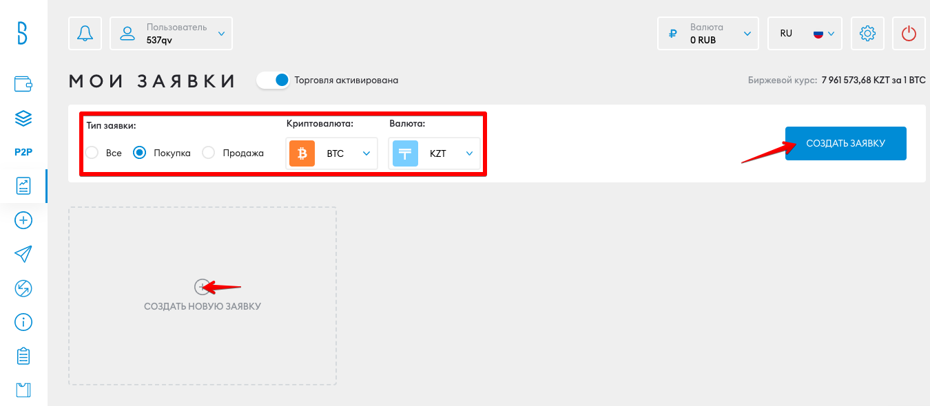 Переходим к созданию заявок. Создание объявлений доступно в разделе «Мои заявки». Переходим в него и кликаем «Создать новую заявку». Мы можем сразу указать тип заявку, а также выбрать криптовалюту и фиатную валюту.