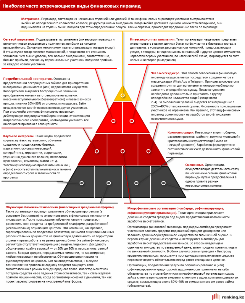 Далее отметим, какие виды финансовых пирамид существуют в мире, в том числе и в Казахстане.