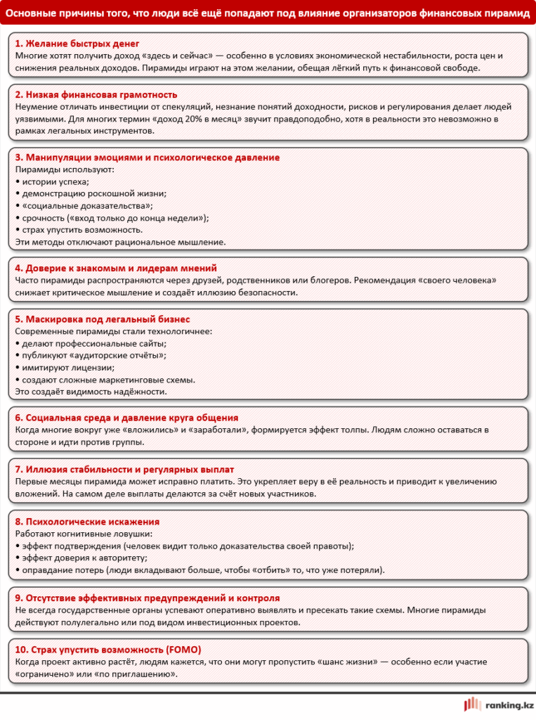 Финансовые пирамиды остаются одной из серьёзнейших угроз финансовой безопасности казахстанцев. Несмотря на растущую осведомлённость населения и усиление контроля со стороны государства, мошеннические схемы продолжают действовать, нанося многомиллиардные убытки и подрывая доверие к легальным финансовым институтам. Ущерб населению страны насчитывается в миллиардах тенге. Только за 2024 год причинённый финансовыми пирамидами ущерб составил 20 млрд тг. И это только по тем организациям, которые удалось раскрыть — реальный ущерб может быть более существенным.
