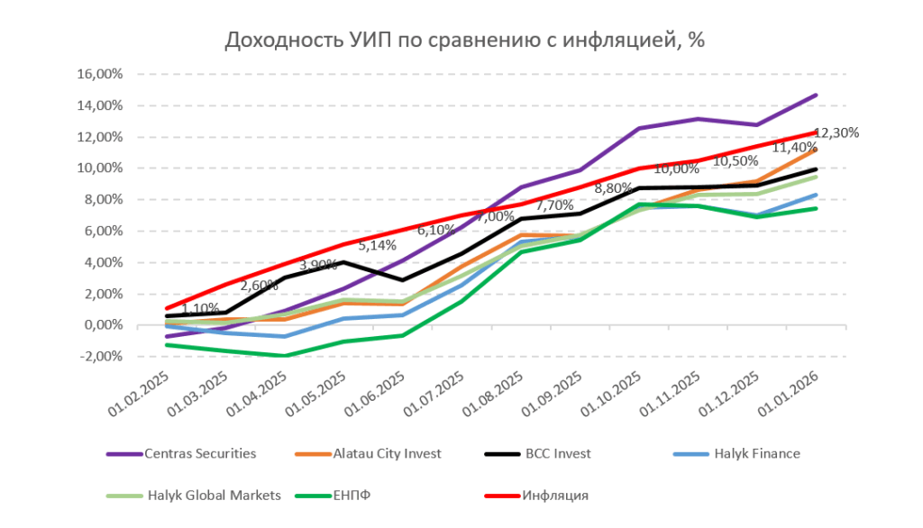 2025 год был непростым для инвестирования. Эскалация торговых войн, а затем деэскалация, опасения по поводу пузыря на рынке ИИ, геополитическая напряженность, региональные конфликты, шатдауны, давление на ФРС со стороны президента – первый полный год под президентством Трампа пестрил волатильностью, но S&P 500 вырос и закончил год 16.4%-ростом, хотя еще в январе мало кто ставил на это. Так, в начале прошлого года консенсусный прогноз по S&P 500 на 2026 от ведущих инвестиционных домов предполагал умеренный рост, а некоторые даже не брезговали ставить на падение рынков. Такая турбулентность на мировой арене не могла не отразиться на финансовых рынках крупнейшей экономики средней Азии. Но у волатильности на казахстанском рынке, помимо вышеупомянутого, были свои причины и их было достаточно. Высокая инфляция, повышение ставки НБРК до рекордных значений, рост доходности ГЦБ по всей длине кривой – все это вкупе с другими факторами также внесли свои коррективы.