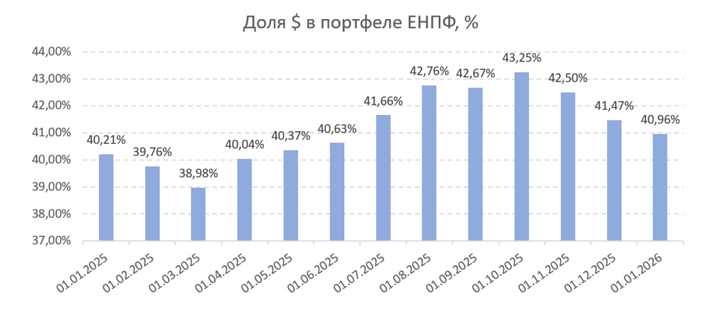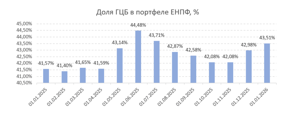 Доходность управляющих пенсионными активами в 2025 году варьировалась в диапазоне от 7,43% до 14,66%. При этом только Centras Securities продемонстрировал номинальную доходность, превышающую уровень инфляции, тогда как остальные участники рынка по итогам года показали отрицательную реальную доходность. Наименее благоприятная динамика была зафиксирована у ЕНПФ, под управлением которого находится около 99,9% пенсионных активов. Инвестиционная динамика Фонда в 2025 году определялась совокупностью макроэкономических факторов, ключевыми из которых стали укрепление национальной валюты и рост доходностей по всей длине кривой государственных ценных бумаг (ГЦБ). ЕНПФ традиционно является крупнейшим держателем ГЦБ. Однако в первой половине года, на фоне рекордных объемов заимствований Министерства финансов, жесткой риторики Национального банка и сохраняющейся неопределенности, связанной с высокой инфляцией, спрос на государственные ценные бумаги со стороны локальных институциональных инвесторов заметно снизился. В этих условиях участники рынка стали требовать более высокую доходность при размещении новых выпусков. В результате в первой половине года ЕНПФ фактически выступал основным покупателем длинных выпусков ГЦБ по тем уровням доходности, на которых они размещались. К концу июня это привело к существенному сокращению ликвидной позиции на балансе Фонда, после чего доходности продолжили рост даже в длинном сегменте кривой (см. рисунок 4). Высокая доля государственных ценных бумаг в портфеле (см. рисунок 6), в том числе бумаг с длительным сроком до погашения (средневзвешенный срок — около 6–7 лет), оказала сдерживающее влияние на инвестиционные результаты ЕНПФ в 2025 году. На протяжении года ЕНПФ стремился поддерживать валютную долю активов на уровне около 40% (см. рисунок 5), последовательно увеличивая валютную позицию вплоть до августа 2025 года. По состоянию на 1 января 2026 года доля активов, номинированных в долларах США, составила 43,51%. В то же время резкое укрепление тенге в период с начала октября до конца года — порядка на 8% — сформировало дополнительное давление на итоговые инвестиционные показатели Фонда.