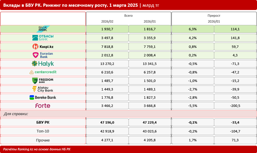 На 1 марта 2026 года вклады в казахстанских банках составили 47,2 трлн тг — на 0,1% (или на 33,4 млрд тг) меньше, чем месяцем ранее. В топовой десятке банков — держателей вкладов в плюсе оказались лишь 4 БВУ.