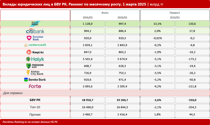 Для справки: вклады юрлиц заняли в совокупном портфеле БВУ РК 40,2%, против 40,8% на 1 февраля 2026-го, 41,7% годом ранее, 48,7% пять лет назад и 55,5% десятилетием ранее.
